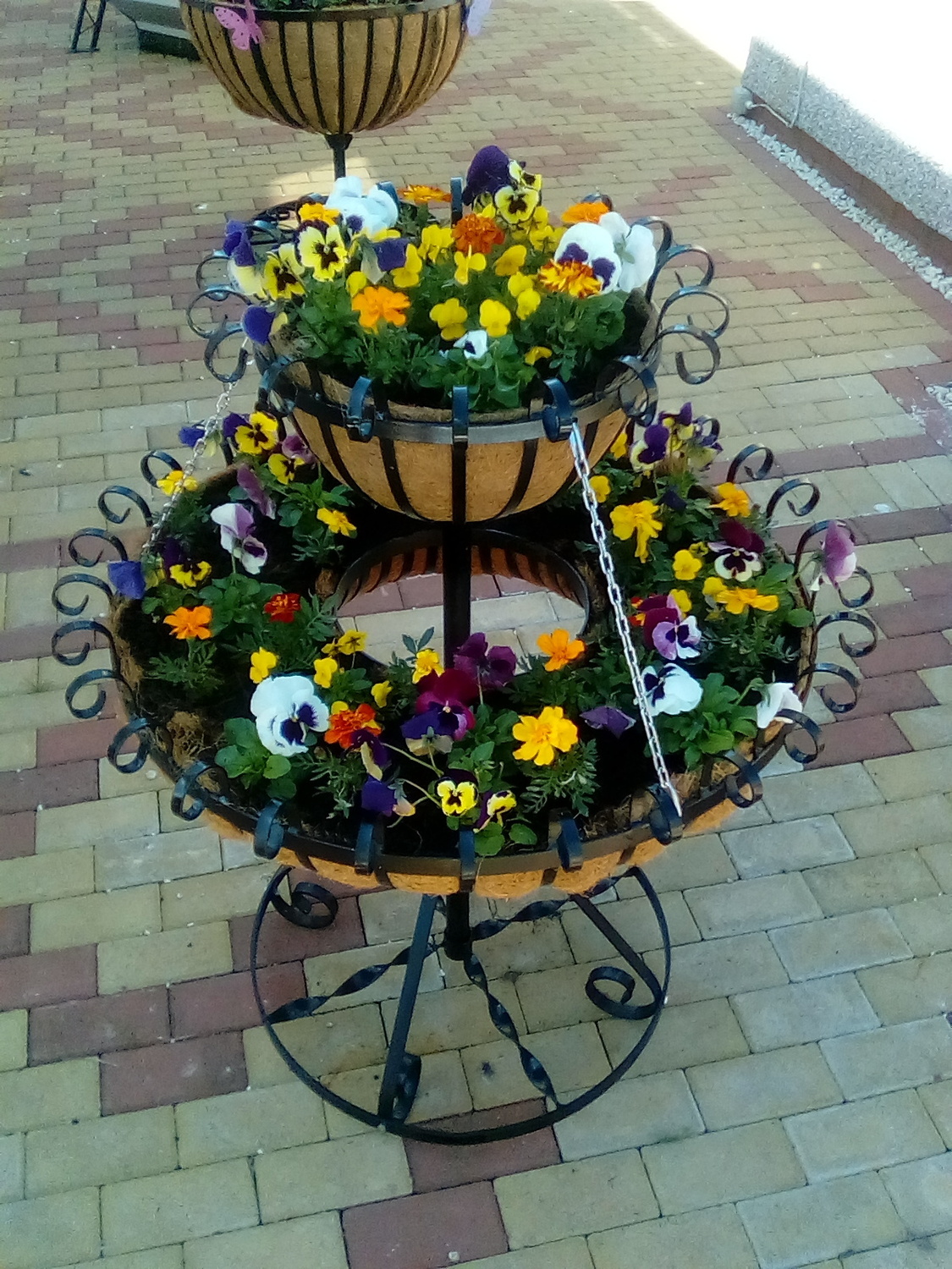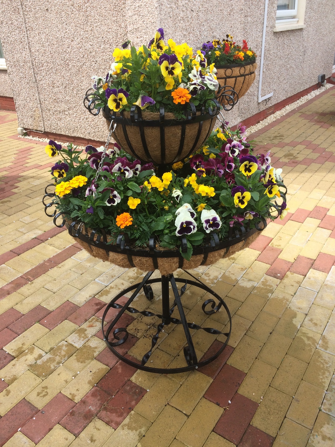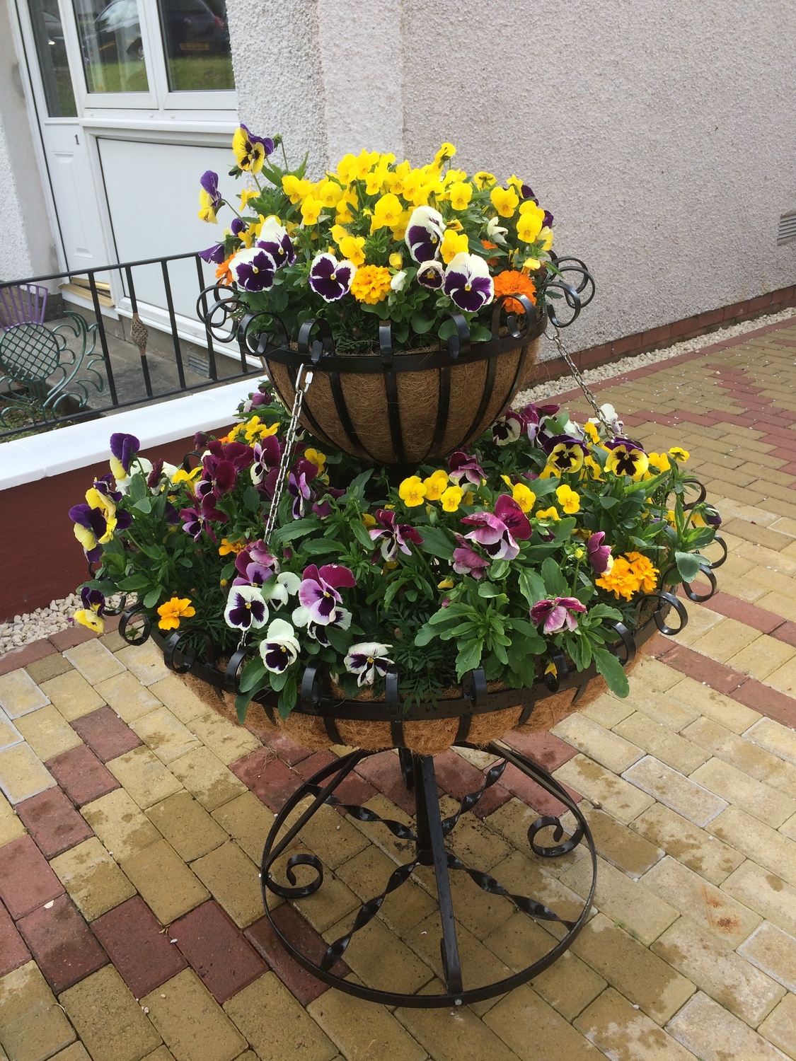 The t 2 tier chandelier planter is 1100 mm high with a 400 mm (16 inch) top tier and a 800 mm (32 inch) main tier. The tiers hold approx 125 litres of compost and can be lined with coco liner or terram.